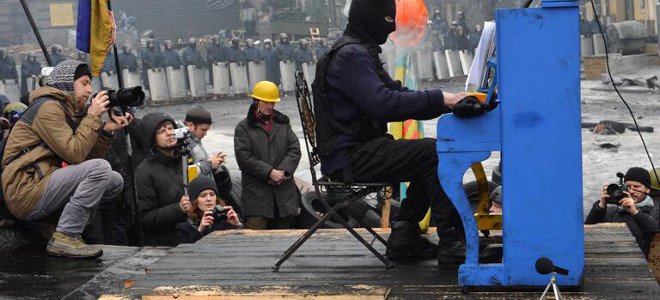 Από τη μία μεριά πάνοπλοι αστυνομικοί παραταγμένοι. Από την άλλη, μασκοφόροι διαδηλωτές. Τριγύρω τα χαλάσματα που έχουν προκαλέσει οι εβδομάδες διαδηλώσεων στην Ουκρανία. Και πάνω σε ένα οδόφραγμα, ένα μπλε και κίτρινο πιάνο.